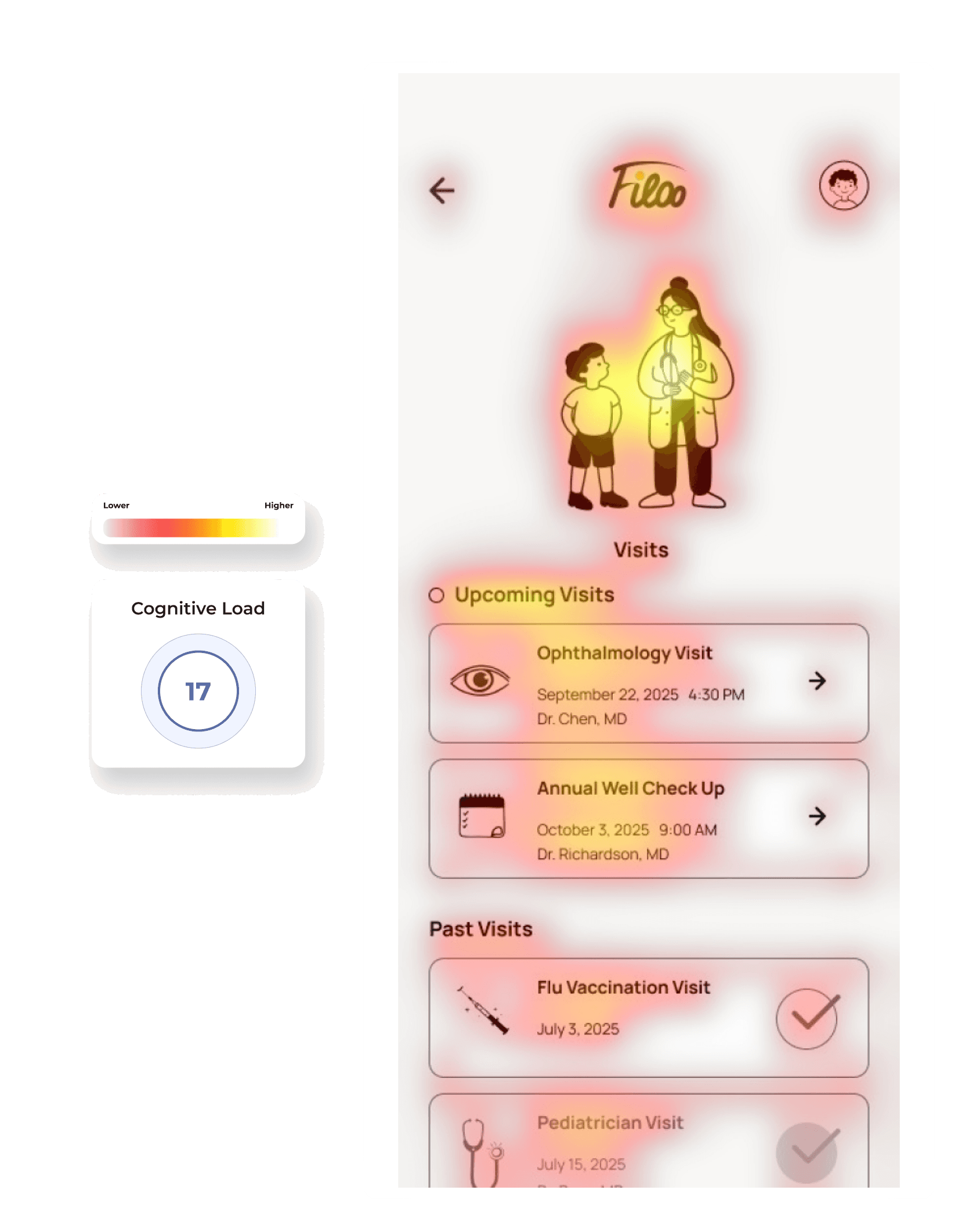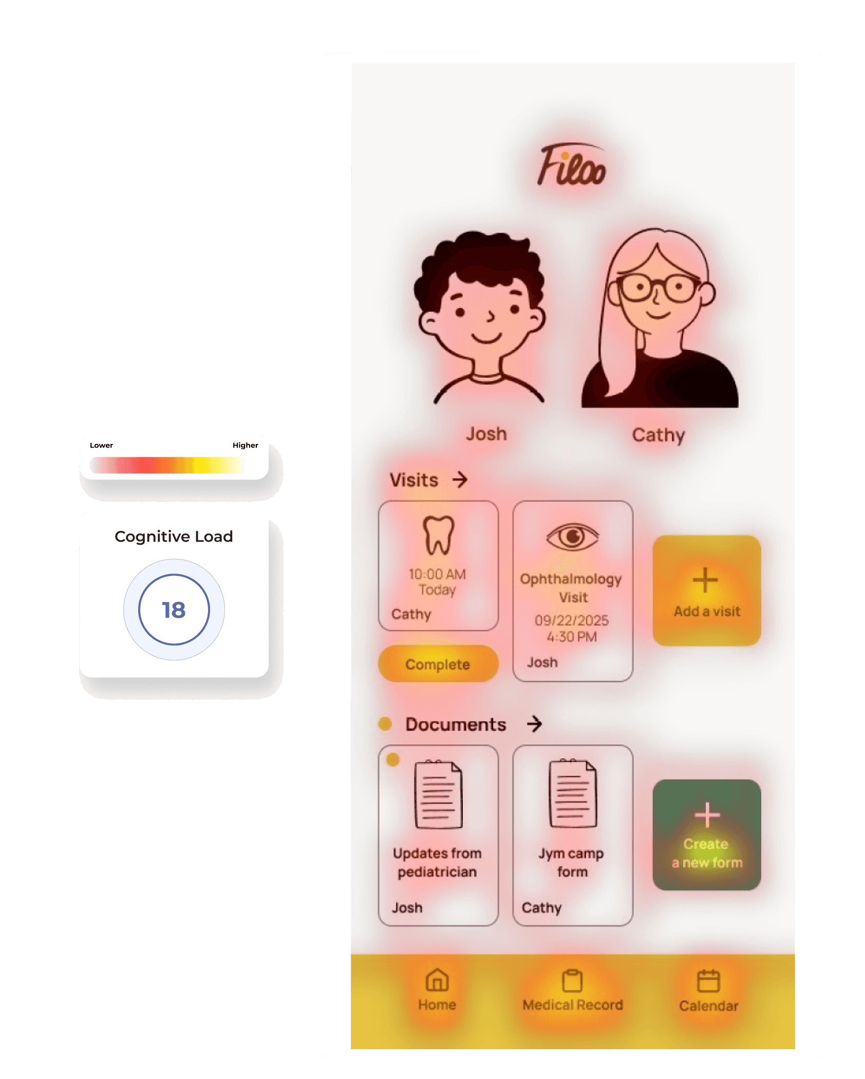 Competitors' clinical aesthetics were contributing to the very stress parents reported. I chose warmth and playfulness as a deliberate counterpoint — but that came at a cost. Cognitive load testing showed results within normal range, but WCAG contrast compliance — particularly yellow on white — is a separate accessibility standard I'd address before any real launch.